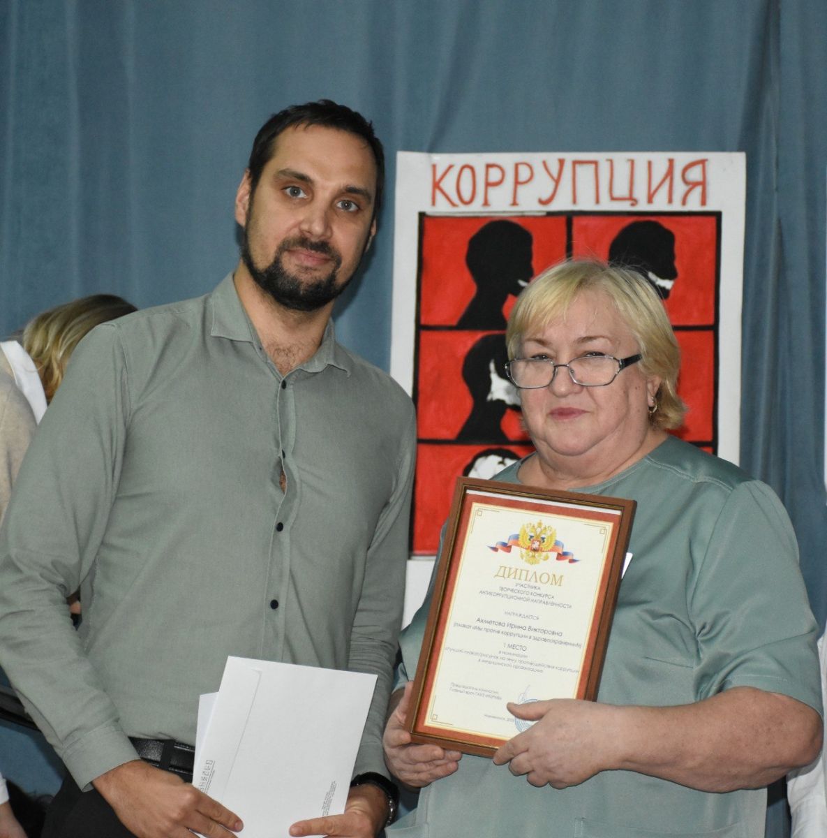 1 место: Ахметова Ирина Викторовна, кастелянша отделения медицинской профилактики для взрослых (работа «Мы против коррупции в здравоохранении»).