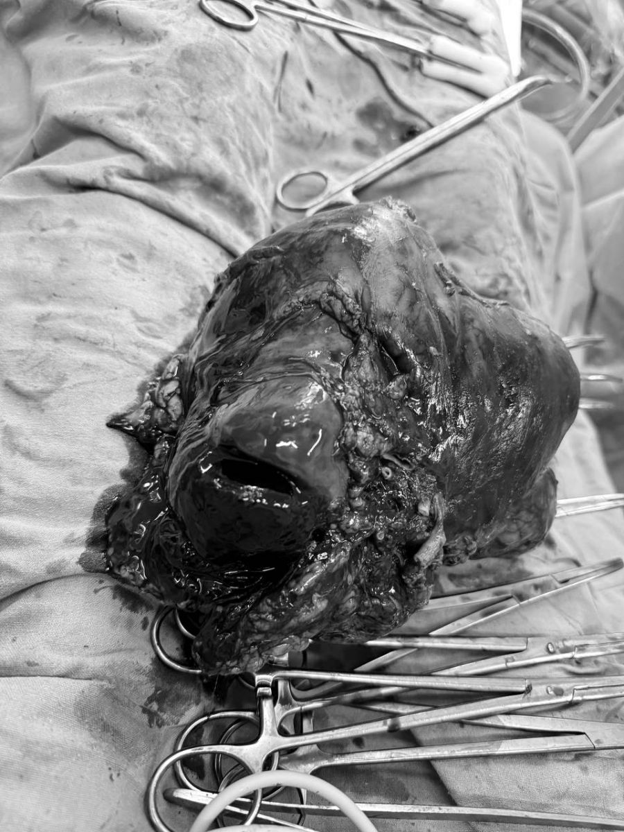 В считанные часы была собрана мультидициплинарная бригада. Консилиум врачей принял решение об экстренном хирургическом вмешательстве. Из-за разрыва анатомия в брюшной полости была грубо нарушена. Почка, увеличенная опухолью до гигантских размеров, более 20 см, сместила внутренние органы, а вся область была пропитана кровью. Потеря крови составила около 2 литров.